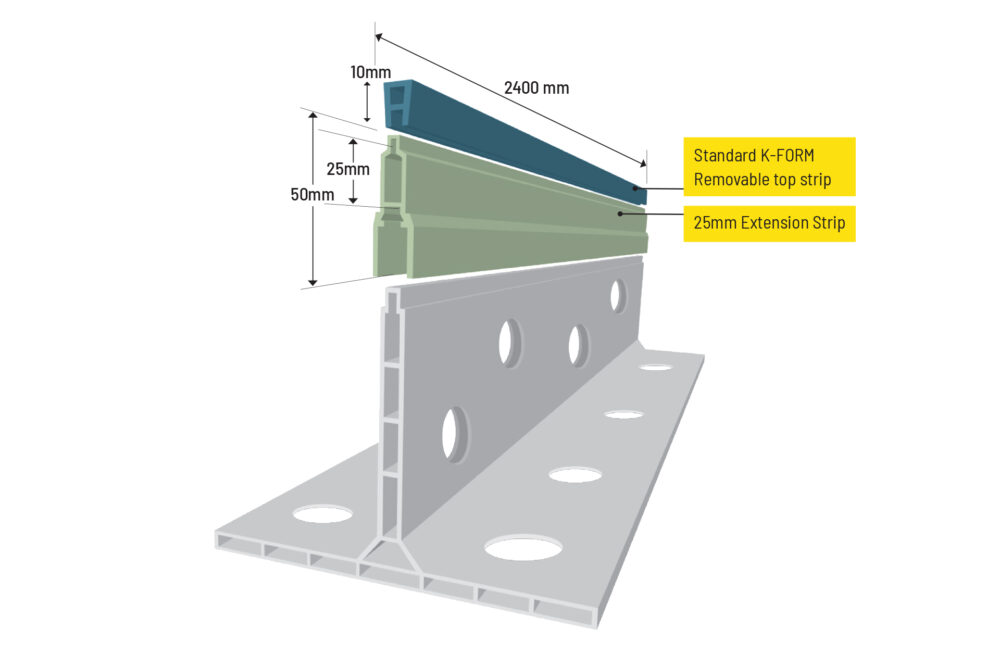 K-Form UPVC Screed Railing provides the construction industry with an economical, efficient and environmentally friendly alternative to steel and timber formwork. The K25 can be installed onto the K85 or K135 products to increase the vertical profile height. The Extension Strip is designed to increase pours of 125 mm-225 mm thick concrete (when used in conjunction with K85 / K135).